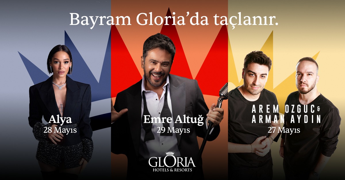 Gloria Hotels & Resorts, Kurban Bayramı’nda üç büyük konserle misafirlerine müzik dolu bir program sunacak. 27–30 Mayıs tarihleri arasında düzenlenecek etkinliklerde Arem Arman, Alya ve Emre Altuğ sahne alacak.