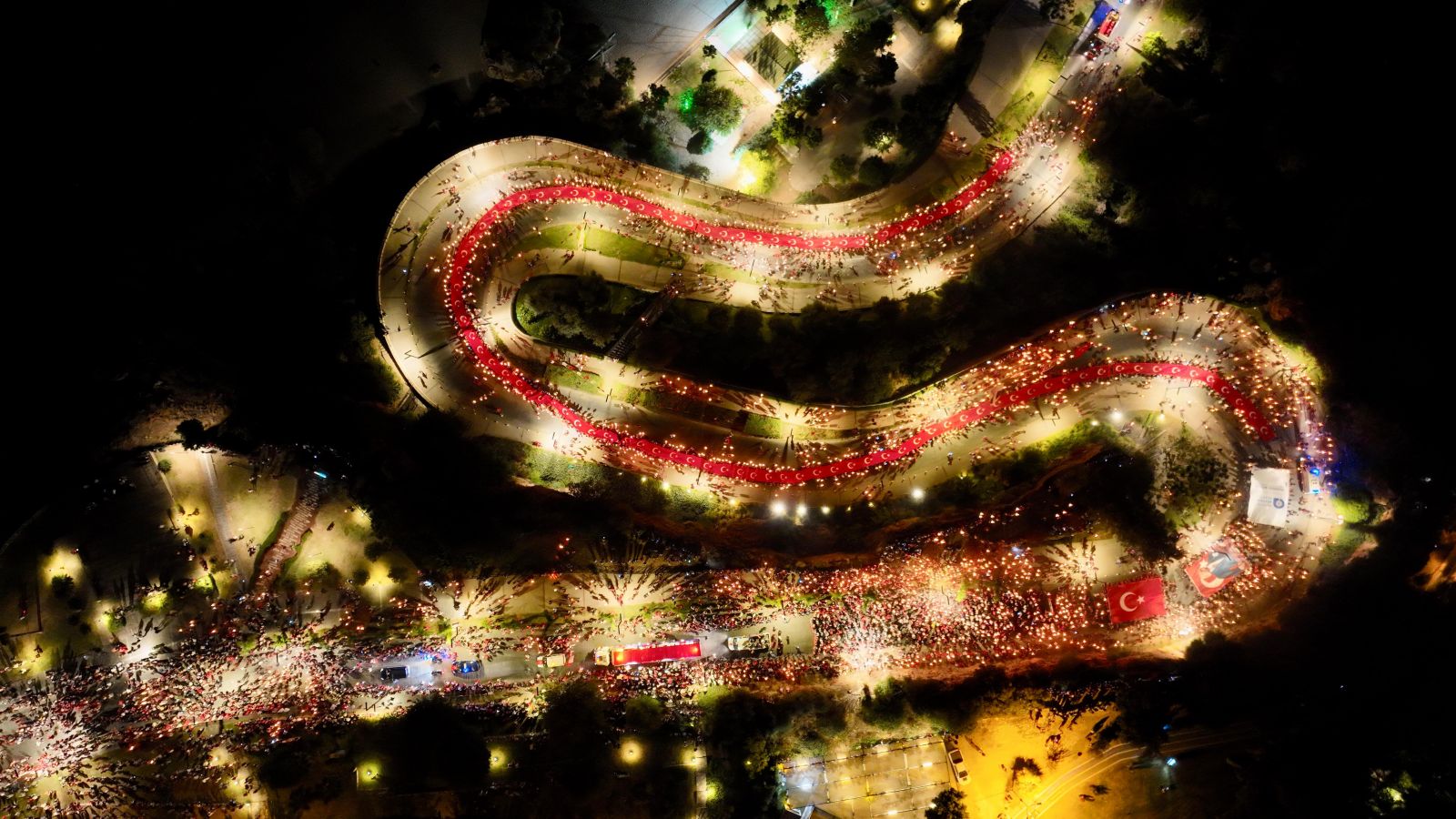 Yaklaşık 400 metre uzunluğunda Türk bayrağını taşıyan Antalyalılar, muhteşem bir görüntü oluşturdu. Ellerinde Türk bayrakları ve Cumhuriyet’in kurucusu Gazi Mustafa Kemal Atatürk’ün posteri ile yürüyen vatandaşlar yürüyüş boyunca marşlar söyledi. Konyaaltı Caddesi tıklım tıklım dolarken, birçok vatandaş da evlerinin balkonundan alkışlarıyla fener alayına katılan vatandaşlara eşlik etti. Fener alayının coşkusu Cumhuriyet Meydanı’na ulaşılmasıyla zirveye ulaştı.