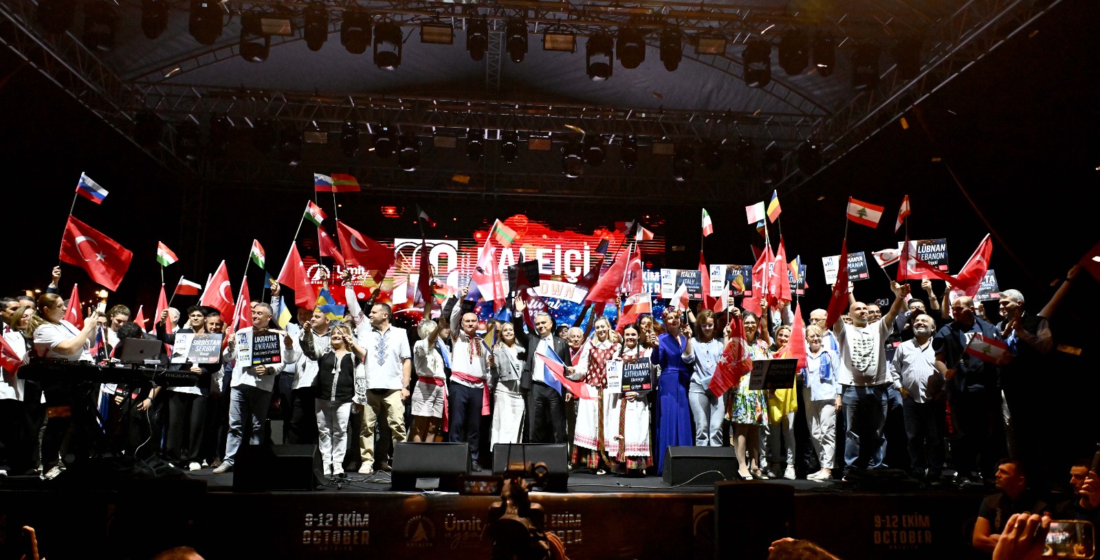 Başkan Uysal’ın konuşmasının ardından, festivale katılan şehirler, geleneksel kostümleri, ellerinde kendi ülkelerinin bayrakları ve Türk bayraklarıyla sahnede Antalyalıları selamladı.